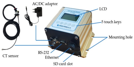The proposed LCMI is 140.0 × 117.0 × 85.5 mm, which is relatively small, and has an aluminum enclosure. External connectors for the AC/DC adapter, CT sensor, RS-232 communication, Ethernet, and SD card slot are placed on one side of the enclosure. The LCMI is designed to meet the IP64 for waterproof and dustproof ratings because it is installed in a coastal area. At the top of the LCMI are a liquid crystal display (LCD) and five touch keys. The product has four mounting holes on the left and right sides for fixation. Figure 3 shows the proposed LCMI.
