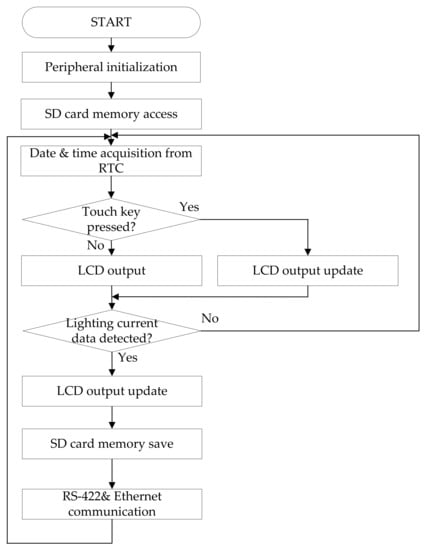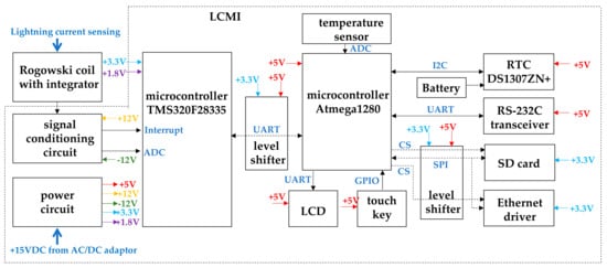 If a cable bridge is struck by lightning, the lightning current flows through the down conductor. A Rogowski coil with a passive RC integrator was installed to encircle the down conductor and sense the lightning current. The output of the Rogowski coil-based current sensor is fed into the signal conditioning circuit inside the LCMI. When a lightning current is detected, the signal conditioning circuit generates an interrupt signal and transfers the lightning current signal to the microcontroller. The microcontroller interrupt service routine analyzes the lightning current signal upon receiving the interrupt signal. The microcontroller measures (front time), (time to half value), Q (energy), and lightning class (whether the lightning current is induced or direct) through lightning current waveform analysis [7]. The microcontroller receives lightning current information analyzed by the microcontroller through a universal asynchronous receiver/transmitter (UART). It saves the lightning current information obtained from the DS and the date and time information from the real-time clock (RTC) to the SD card. For the battery, Seiko Semiconductor’s MS920SE-FL27E was used to prevent the date and time information of the RTC from being deleted when the power was turned off. The LCMI has an LCD to display information. The data are transmitted via Ethernet and RS-232C. The power circuit receives 15 VDC from the AC/DC adapter. The output of the power circuit consists of ±12 V for the signal conditioning circuit, +5 V for the microcontroller, and +3.3 V and +1.8 V for the microcontroller. Level shifters were used between the microcontroller and the microcontroller and between the microcontroller, SD card, and Ethernet drivers to adjust the voltage levels. The LCD was be used to check the detection data. A touch key was used for the field operation. Figure 4 shows a block diagram of the proposed LCMI.
