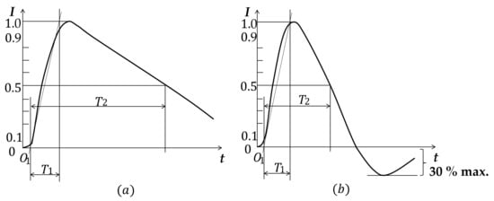 Figure 6 shows the international standard current waveforms from direct and induced lightning, where is the virtual origin, is the peak current, is the front time, and is the time to half the value. Table 2 presents a comparison of the characteristics of the two lightning current waveforms [8,11].