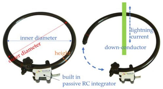 In general, lightning current is detected using a current transformer. To measure a high surge current, a Rogowski coil that does not saturate even at a high current or an expensive and large current transformer with good frequency characteristics is used [20,21]. The proposed LCMI uses an air core Rogowski coil at a price of several hundred dollars, which is relatively economical. The voltage induced in the coil is proportional to the rate of change (differentiation) of the current flowing in the down conductor, and the lightning current signal is the output of the built-in passive RC integrator. The demountable Rogowski coil current sensor used in this study is shown in Figure 7, and its specifications are listed in Table 4 [22].
