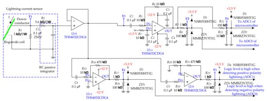 The signal conditioning circuit in Figure 8 consists of a voltage follower to remove the loading effect, an inverting amplifier composed of that can process a lightning current signal of 500 A to 10 kA, and an inverting amplifier composed of that can process a lightning current signal of 10 kA to 100 kA. In addition, the non-inverting amplifier configured in can detect positive-polarity lightning currents, whereas the inverting amplifier configured in can detect negative-polarity lightning currents. , , , , , , , and are used as protection circuits to prevent the microcontroller overvoltage.