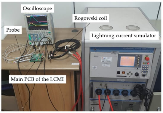 The signal conditioning circuit proposed in this study was tested by applying an induced lightning current generated by a lightning current generator. The experimental setup is shown in Figure 10, the measurement equipment is listed in Table 6, and an example of the experimental results is shown in Figure 11.