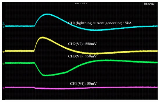 In Figure 10, when an induced lightning current of 5 kA is applied from the lightning current generator, the output of the Rogowski coil appears as a differential waveform, the output of the voltage follower that has passed through the integrator appears similar to the applied current waveform, and the output voltage is measured as 550 mV. The waveform of , which is an input to ADC0, appears as an inverted waveform. In addition, the waveform of , input to ADC1, appears at 1/10th the amplitude of that of ADC0.