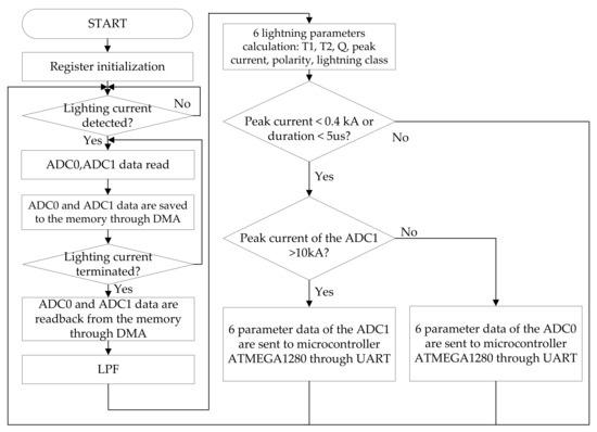 When power is applied to the LCMI, the registers of the microcontroller are initialized. When a lightning current is detected, the converted data from ADC0 and ADC1 are stored in the memory through direct memory access (DMA). When the lightning current signal is terminated, the stored data of ADC0 and ADC1 are read back through the DMA. The reason for this process is to make the ADC sampling time as fast as possible. To remove the noise from the lighting current signal, signal processing is performed using a low pass filter (LPF). The microcontroller then calculates six parameters of the lightning current signal: , , Q (coulomb), peak current, polarity, and lightning class. If the peak current is less than 0.4 kA or the duration time of the lightning current is less than 5 μs, it is classified as noise. If the peak current of ADC1 is greater than 10 kA, 6 lightning parameters extracted from ADC1 are transmitted to the microcontroller through the UART. If the peak current of ADC1 is less than 10 kA, the 6 lightning parameters extracted from ADC0 are transmitted to the microcontroller through the UART. The signal processing software algorithm for the lightning current is shown in Figure 12.