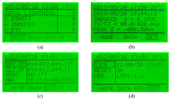 When power is applied to the microcontroller ATMEGA1280, it initializes the peripheral devices. The microcontroller reads the lightning current detection data from the SD card and the date and time information from the RTC. The lightning current detection and time information are displayed on the LCD. When the touch key is pressed, the LCD screen is updated accordingly. When an LCMI receives the lightning current detection information from the microcontroller (TMS320F28335), it displays the information on the LCD, stores the information in the SD card memory, and transmits the data through RS-422 and Ethernet communications for remote monitoring. The LCD information display consists of four screens. The first screen shows the number of direct and induced lightning current detections, and the second screen shows the detected date and time, lightning class, polarity, Q (coulomb), , , and peak current. The third screen sets the Ethernet IP address for remote monitoring, and the fourth screen sets the date and time and shows the RESET function to initialize the internally detected stored data and the software version. An example of an LCD screen is shown in Figure 14.