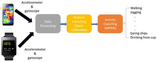 The proposed HAR system has three components: a data processing unit, a feature extraction unit, and a classification unit, as illustrated in Figure 1. Physical activity signals are captured by a smartphone and a smartwatch and are subsequently sampled, segmented, and reshaped for further processing. The sensor data features are extracted using a hybrid CNN+RNN model. Finally, an MPNN is employed to classify the 18 types of physical activities.