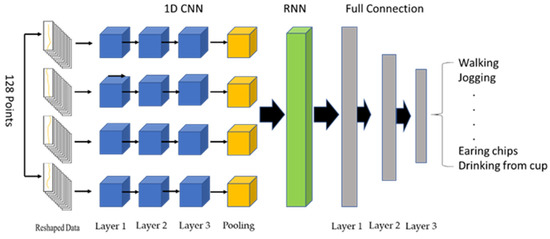 Figure 2 illustrates a feature-extraction model that employs a hybrid CNN and RNN to extract the features of sensor signals. The fully connected layer, consisting of three layers, is used to classify the 18 types of physical activities. After training, the outputs of the RNN for the training samples serve as the feature samples to train the activation-classification models. Since the human movements in each activity occur in chronological order, the sensor signals represent time-sequential data. To address this, a time-distributed layer comprising four 1D CNNs (i.e., four pairs of CNNs with three layers and a maximal pool layer as the last layer) is stacked on top of the RNN. This separates a sample into four segments, with each segment containing 32 points. In the convolutional layer, the number of filters is 64; the kernel sizes are 3, 5, and 13; the stride is 1; and the padding is 4. In the pooling layer, the kernel size is 2, and the stride is 2. The activation function employed is ReLU. The RNN is replaced with the LSTM, BiLSTM, GRU, or BiGRU, with the unit numbers of LSTM and GRU set to 128 and those of BiLSTM and BiGRU set to 256. The batch size is set to 32, with the control reset gate and update gate using a sigmoid function and the hidden state using a tanh function. The numbers of full connection layers are 128, 64, and 18, respectively, with ReLU used as the activation function in hidden layers and softmax in the output layer. The loss function is the categorical Cross-Entropy (CE) function, and the Adam optimizer is used [41], with the learning rate set to 0.0001. Equation (1) is the formula for categorical CE: