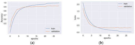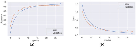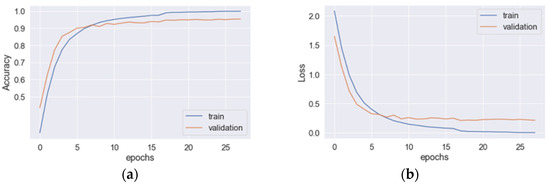 The learning curves for the hybrid CNN+BiGRU model: (a) the accuracy and (b) loss curves.