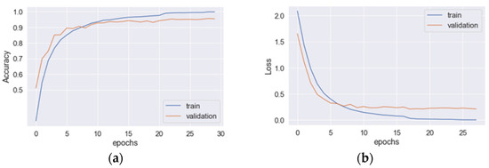 The learning curves for the hybrid CNN+LSTM model are depicted in Figure 3, where (a) and (b) represent the accuracy and loss curves, respectively. The blue line corresponds to the training data, while the original line corresponds to the validation data. The optimal values for the accuracy and loss function are achieved at epoch 29. When applied to the testing data, the model achieved an average precision, recall, F1-score, and accuracy of 93.8%, 93.8%, 93.8%, and 94.1%, respectively. The total training time for the model was 130.26 s. In Figure 4, the learning curves for the hybrid CNN+GRU model are presented, where (a) and (b) denote the accuracy and loss curves, respectively. The blue line represents the training data, while the original line represents the validation data. The optimal values for the accuracy and loss function are attained at epoch 28. When evaluated on the testing data, the model achieved an average precision, recall, F1-score, and accuracy of 92.6%, 92.6%, 92.5%, and 92.2%, respectively. The total training time for the model was 98.67 s. The learning curves for the hybrid CNN+BiLSTM structure are displayed in Figure 5, where (a) and (b) represent the accuracy and loss curves, respectively. The blue line corresponds to the training data, while the original line corresponds to the validation data. The optimal values for the accuracy and loss function are achieved at epoch 30. When applied to the testing data, the model achieved an average precision, recall, F1-score, and accuracy of 95.3%, 95.3%, 95.3%, and 95.3%, respectively. The total training time for the model was 138.86 s. In Figure 6, the learning curves for the hybrid CNN+BiGRU model are presented, where (a) and (b) denote the accuracy and loss curves, respectively. The blue line represents the training data, while the original line represents the validation data. The optimal values for the accuracy and loss function are attained at epoch 29. When evaluated on the testing data, the model achieved an average precision, recall, F1-score, and accuracy of 95.7%, 95.4%, 95.5%, and 95.2%, respectively. The total training time for the model was 108.69 s. Table 2 provides an overview of the performances of four feature-extraction models. Although the hybrid structures with BiLSTM and BiGRU require more training time per epoch than LSTM and GRU (4.60 s vs. 4.49 s and 3.74 s vs. 3.52 s, respectively), their testing accuracies are superior to those of LSTM and GRU (95.3% vs. 94.1% and 95.2% vs. 92.2%). Given that the hybrid structure with BiGRU saves 19% of training time compared to BiLSTM and that their accuracies are very similar (95.25% vs. 95.3%), the feature-extraction model based on the hybrid CNN+BiGRU structure was chosen for building the HAR system.