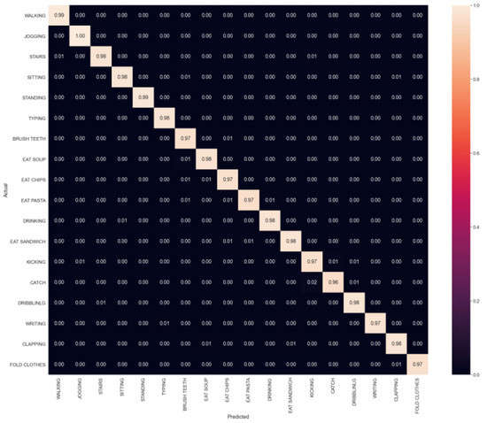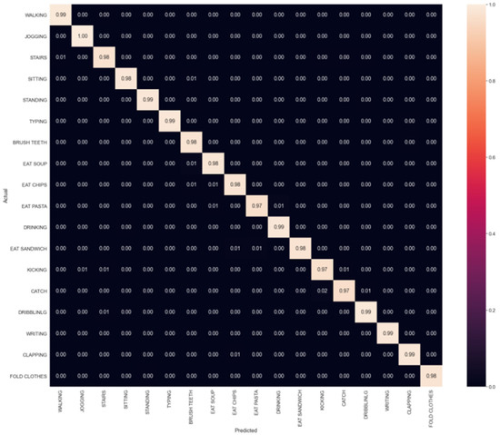 For the ELM algorithm, the SLFN had one hidden layer with 6000 nodes. Figure 7 shows the confusion matrix of the classification of eighteen activities. The performances of writing, clapping, brushing teeth, eating chips, and drinking from a cup activities were better than those for the ELM algorithm. Table 6 presents the performances of the SLFN with the ELM algorithm on the testing data. The model achieved an average precision of 97.9%, a recall of 97.9%, an F1-score of 97.9%, and an accuracy of 97.8%. The total training time was 7.52 s. The F1-scores for the eating pasta, catching a ball, and eating a sandwich activities rose to 98.0%, 96.4%, and 98.1%, respectively.