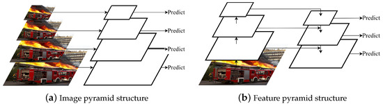Object detection is a challenging task because of the inherent variability in the shapes, features, and scales that need to be detected. Some objects may be extremely small or large or have non-standard shapes. CNNs are often used to construct high-level networks that capture rich semantic information. However, they may have low-resolution feature maps and weak geometric details. On the other hand, low-level networks can have high resolution and abundant geometric information but limited semantic information and small receptive fields. To address the multi-scale detection problem, a common approach is to predict small objects on high-resolution feature maps and large objects on low-resolution feature maps, leveraging high-level semantic information to improve accuracy. Multi-scale features can be generated using image or feature pyramid structures, as illustrated in Figure 1. The key idea is to use these multi-scale features to detect objects of different scales.