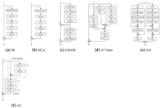 Self-attention is a unique form of attention that aims to reduce dependence on external information and maximize the utilization of inherent feature information for attentional interaction. Typically, self-attention is achieved by mapping the original feature map into three vectors: the query matrix, the key matrix, and the value matrix. Firstly, the relevance weight matrices of the query and key matrices are calculated. Secondly, the weight matrices are normalized. Finally, the weight coefficients are combined with the value matrices to model global contextual information [49]. X. Wang et al. applied self-attention to computer vision and proposed the non-local (NL) module, which captures long-range feature dependencies by modelling global context through a self-attention mechanism [50]. The dual attention (DA) module, proposed by J. Fu et al., integrates both the channel attention module and the spatial attention module, using channel features and spatial pixel points as query conditions for context, respectively, to adaptively combine local features and global dependencies [51]. Y. Cao et al. proposed the global context (GC) module, which combines SE and a simplified spatial attention module to replace the original spatial downsample process and reduce the computational effort of compressing feature maps based on global pixel points using 1 × 1 convolution [52].