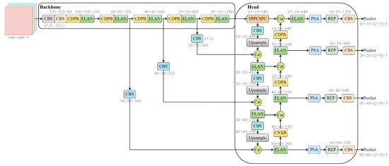 We propose an efficient detection method based on deep learning to address the scale variation of fire and smoke. Considering the real-time nature and high transparency of fire smoke, our method is primarily based on the latest YOLOv7 model structure [53]. It combines an attention mechanism, a re-parameterization convolutional structure, and a simplified ConvNeXt module [54], as shown in Figure 3. The model consists of several key modules: CBS, ELAN, SPPCSCP, PSA, and REP. The CBS module includes a convolutional layer, BN layer, and SiLU activation function. The ELAN module is composed of nine CBS and consists of two branches, one of which passes through six more CBS with a two CBS overlap between each. Finally, the two branches are spliced, and the output size is adjusted through CBS. The SPPCSCP module comprises a CBS and a pooling layer, which extends the perceptual field and allows the model to adapt to images of different resolution. The permutation self-attention mechanism (PSA) aims to obtain contextual information about all the pixels in its cross path. Through further recursive operations, each pixel can finally capture the dependency of the entire image. By incorporating these improvements, we significantly enhance the model’s fire and smoke detection efficiency.