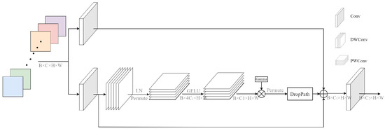 Feature extraction networks play a crucial role in improving models’ detection efficiency and accuracy. CNNs have gained widespread attention and carried out many pioneering works in the field of computer vision under their ability to accurately capture high-level semantic information. However, with the continuous development of the Transformer model, which has the advantages of scalable behaviour and multi-headed attention mechanisms, it has gradually replaced CNNs in terms of function and is widely used in computer vision downstream tasks, such as image classification, object detection, and semantic segmentation. However, the use of attention mechanisms leads to an abrupt increase in model complexity. The visual transformer (ViT) model generates a single low-resolution feature map with a computational complexity that is quadratic to the input image size [56]. The shifted windows transformer (SwinT) model, on the other hand, solves this problem using a hierarchical structure similar to that used in CNN and local attention to achieve a computational complexity linearly related to the size of the input image, indirectly demonstrating the importance of CNN in feature extraction [57]. Therefore, the ConvNeXt module is built on a normalized convolutional structure, as shown in Figure 5, borrowing the structure and training model of the Transformer model in order to obtain high accuracy and scalability.