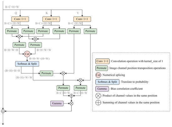 For channel attention, it is easy to ignore information interactions within space as it is a global processing of information within a channel, while spatial attention treats the features in each channel equally, which easily ignores the information interactions between channels. Therefore, in this paper, we consider using self-attention, as shown in Figure 6, to capture the remote contextual information in both horizontal and vertical directions as accurately as possible. Specifically, the input image is passed through a deep convolutional neural network to generate a feature matrix M. The reduced feature matrix is first passed through a convolutional layer to obtain a reduced-dimensional feature matrix, and then the reduced feature matrix is replaced by a permutation operation to generate a new feature matrix . Finally, the long-distance contextual information is aggregated , and each pixel is synchronised in a cross displacement.