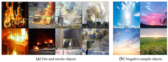 Since there is no publicly available detection dataset for the fire and smoke object detection task, the experimental data in this paper are mainly derived from natural fire scenes and web video screenshots, including hundreds of real-life scenarios in total. Similar negative samples are considered to be added to the dataset to prevent the adverse effects caused by environmental factors, such as sun, clouds, smoke, lighting illumination, and others. The final experimental dataset of 14,904 photos was collected, with 13,843 images in the training set and 1061 images in the validation set, including a total of 116,709 fires and smoke target objects, some of which are displayed in Figure 7. To extract the coordinate information of the target items, we utilized the LabelImg program to label the dataset with the position coordinates, height and breadth, and target area. LabelImg merely labels the dataset in VOC format and transforms it to YOLO and COCO formats to fulfil the training needs of different models. To prevent model overfitting during training, the data enhancement methods include random rotation, random scaling, random cropping, random fusing, and change of saturation and chromaticity.