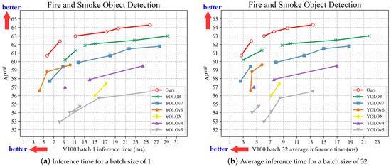 Considering the specificity of fire smoke detection, which requires both accuracy and speed, a comparison of the speed and accuracy of different variants of the one-stage detection algorithm was thus performed, as shown in Figure 8, where our model has a 62.5% map and 113.6 FPS on V100, placing it ahead of other one-stage detection methods. To further validate the model’s accuracy, the results of standard one-stage detection methods were evaluated using test time augmentation (TTA), a technique used to improve the performance of neural network models and reduce generalization errors [63]. The training set was extended by using modified copies of the samples from the training dataset, the original data was augmented in different forms, and then the average of each result was taken as the final result, as provided in Table 3. On the fire smoke dataset, the highest accuracy our model could achieve after using TTA was 65.1%, 1.2% higher than the accuracy of YOLOR-CSP-X after using TTA.
