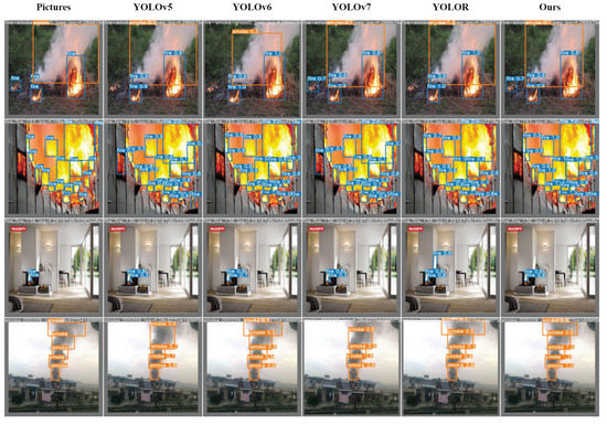 The results of our ablation experiments provide further evidence that our improved method enhances the accuracy of fire smoke detection and effectively addresses the issue of scale change in flames and smoke. To illustrate the performance of our one-stage object detector, we present a visualization of the results on the validation set in Figure 10. The “Pictures” in the figure represent the ground-truth bounding boxes corresponding to the original image. Upon comparison of each detector’s output with the original image, we observe that YOLOv5, YOLOv6, and YOLOR all missed the detection of the flame object in the lower left corner of the first image. YOLOR incorrectly detects the light solid area in the second image as a flame object. Moreover, YOLOv5 and YOLOv7 exhibit poor detection performance on the overlapping regions of the second and fourth images. In the original image of the fourth example, there are five target objects, yet both YOLOv5 and YOLOv7 detect only four objects.