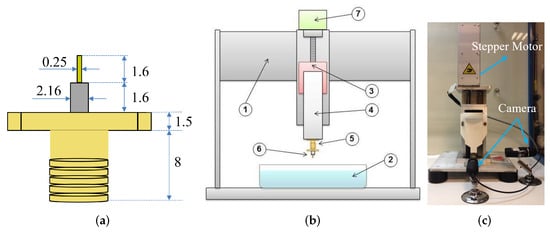 Experimental setup. (a) Geometry of the SMA flange connector, all the dimensions are in mm; (b) schematic of the experimental arrangement (1. Mechanical frame, 2. Solution container, 3. Movement assembly, 4. Moving stage, 5. SMA Male Plug, 6. SMA female connector, 7. Stepper motor); (c) photograph of the experimental arrangement.