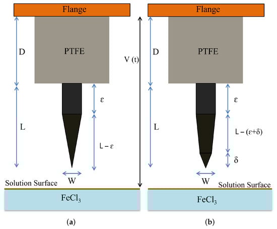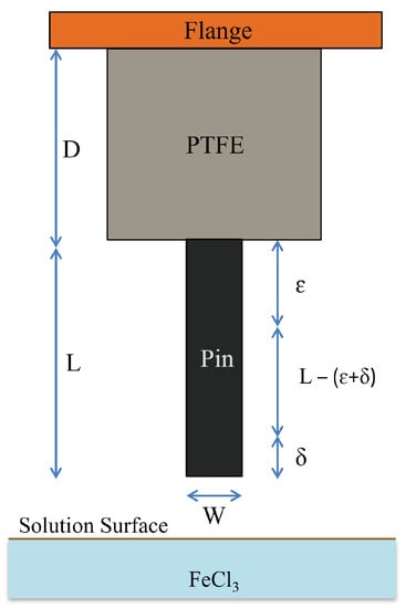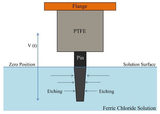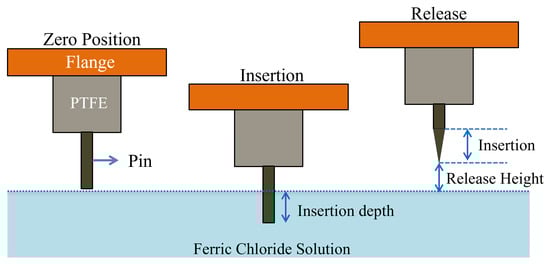 In the geometry, the flange is followed by a dielectric material with a length D, and the pin with full length L. For improving the etching control, a small distance should separate the dielectric from the pin. is a quantity to be defined, related to meniscus effects close to the surface of the liquid (etching) solution, which may influence the shape at the end of the pin. The full process flow of insertion and release is illustrated in Figure 3. The resulting shape of the pin after the etching is qualitatively shown in Figure 4a,b. Meniscus effects manifest themselves when the end of the pin is close to the liquid surface; in this case, the dipping begins before the full immersion as well as when the pin is going out from the etching solution. Increasing the release height is essential to avoid any solution sticking with the pin.