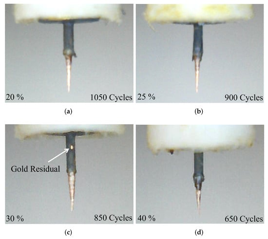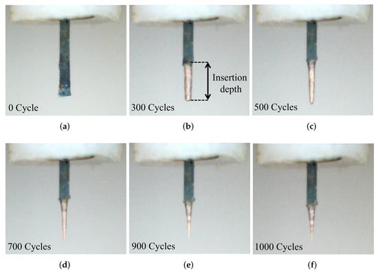 As shown in Figure 6a–f, the tapering of the pin started to be visible after 300 cycles and increases further with a higher number of cycles. The sharp tapered tip with the desired quality was achieved around 1000 cycles.