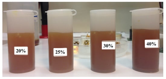 The next set of optimizations was performed by varying the concentration of the etchant ferric chloride solution. Figure 7 shows the photograph of the prepared etchant solutions with a concentration of 20%, 25%, 30%, and 40%, respectively. The parameters related to the optimization process are listed in Table 2. Both the velocity and insertion depth has been kept constant for this set of optimizations to have a reasonable comparison between the different concentrations.