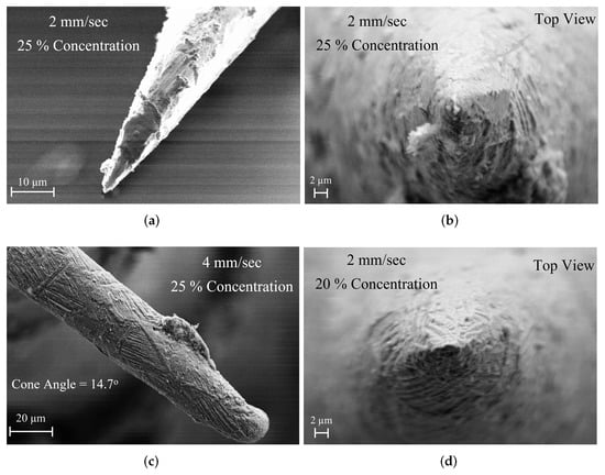 Figure 9 shows the SEM images of the fabricated tips. Figure 9a shows the tip fabricated with etching parameters of 2 mm/sec velocity with a 25% concentrated solution and Figure 9b shows the top view of the tip. Figure 9c shows the fabricated tip with a higher velocity. Due to the high moving speed, the control of the etching process was a little harder and the obtained tip has an apex diameter of more than 10 m at 650 cycles, sharper tips can be obtained by increasing the number of cycles. Figure 9d shows the tip fabricated with a low concentrated solution, and, due to the slow process, the etching was completely controllable and the final tip shape was good with a tip apex size of less than 1 m. A small perturbation in the process comes from the vibration induced by the stepper motor, and we expect that a shape with less surface roughness can be obtained by improving the mechanical control. By controlling the vibration which arises from the stepper motor, better control over the shape of the tip apex with less surface roughness can be achieved. The morphological analysis evinces that the tips with a micrometer and sub-micrometer apex sizes can be effectively obtained through this etching mechanism. This shows a remarkable agreement with the discussion of the etching process presented in the previous sections. Specifically, the final shape of the etched tip is consistent with what was previously described. Additionally, the chemical process used for etching was applied to the last 0.7 mm of the pin’s total length of 1.6 mm. Moreover, the width of the pin was reduced from 254 m to ∼1 m (approx.) after the etching process.