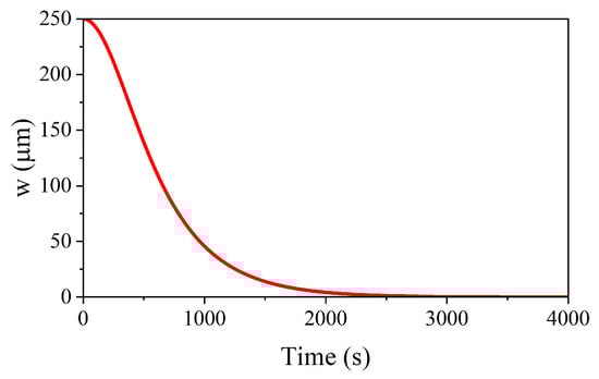 Using the previous equations to compare the experimental results with theoretical expectations leads to underestimating the expected etching rate. By studying the result shown in Figure 9d, where the measured end of the tip is lower than 1 m, i.e., almost fully etched, the theoretically expected final width of the tip using the same process parameters should be obtained quickly. The etching rate estimated by inverting Equation (5) should be m/sec (approx.). Looking at the predicted etching speed, we should have a very slow etching process. Considering that we needed almost an hour (approx. 50 min) to complete the process, we have to account for a longer time of etching. Such a delay is justified by the necessary onset of the process, which does not start immediately. Still, it needs an activation time related to a few parameters: (i) concentration of the etching solution and (ii) temperature. Therefore, the etching rate as a function of time can be regarded as a sigmoid curve: it will exhibit a slow start, an increase, and a plateau, at least for reasonable times, assuming that the chemical solution is not changed over time owing to the small size of the tip respect to the volume of the etching liquid. To date, the value previously inferred can be considered the plateau of the sigmoid curve, similar to those presented in detail in Figure 4 of [35]. We have a lower rate because, in our case, no stirring of the solution has been included, to improve the quality of the etched surface. An evaluation of the time necessary for the complete etching of the pin can be done considering the results obtained in terms of the chemical solution efficiency. We already discussed the evidence for an effective etching when at least 300 dipping cycles are imposed at the dipping velocity of 2 mm/s. Since the pin is dipped for 0.7 mm, the dipping time for a single cycle is s s. This can be considered equivalent to saying that the effective time to begin the process with the concentration 20% and at the room temperature is ss. The function for describing the etching up to the complete dissolution of the Cu apex of the pin can be written, accounting for the initial value of the diameter and for the normalization to 1 when the process is beginning, by using the inverse of a hyperbolic cosine, such as: