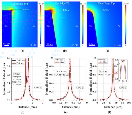 Simulated electric field map of the probes. (a) cylindrical pin; (b) flat edge tip; (c) blunt edge tip. (d) Normalized E-field profile of the cylindrical pin taken at two different distances from the pin. The field profiles of the flat and blunt edge conical tapered tips were taken at a vertical distance of (e) 10 m and (f) 1 m.