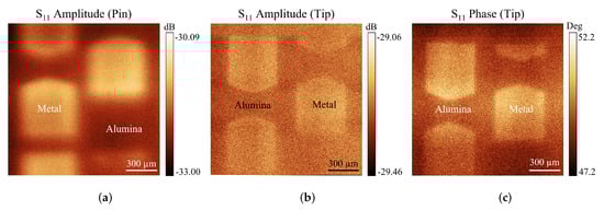 SNMM imaging has been performed using the same setup described in [41], with a motorized test fixture to move the sample with respect to a fixed tip, vertically positioned at a short distance from the surface of the sample. Fixing the tip and moving the sample corresponds to an improvement in the measurement stability, owing to the small power collected as a reflected signal. In fact, there are significant signal losses along the travel on the air from the tip to the sample and back to the tip. The setup is designed to have a non-contact measurement, with the tip scanning over the sample at a distance of a few m. Since the tip is rigid, this solution allows a stable and sensitive measurement without damaging the sample surface or producing any wearing to the tip during the scanning procedure. In fact, the tip is sensitive enough to receive back a non-negligible amount of reflected power even without touching the surface, but it is also small enough to maintain a high resolution of the measurement even over an extended area of characterization. Amplitude and phase measurements () of the reflected signal have been performed using a vector network analyzer (VNA) to compare the results of both data. In [42], the criterion to choose a measurement at resonance or off-resonance (but close to it) has been discussed, with the aim to enhance the picture’s contrast for imaging purposes. The setup includes phase shifters and resonance elements. This solution does not allow an instant broadband measurement, but it is ideal to have high-quality and well-contrasted images at frequencies determined by the multiple resonances of a -resonator. The result is shown in the images of Figure 12, for metal planar shapes manufactured by photolithography of gold deposited on an alumina substrate. A virgin pin Figure 12a has been used as a reference, comparing the measurement without etching of the pin with the images obtained using the amplitude Figure 12b and the phase Figure 12c of the reflected signal obtained with an etched micrometric pin. It is evident the quality improvement when passing from Figure 12a to Figure 12b,c. The higher of Figure 12a compared to Figure 12b is attributed to its bigger tip area available to receive the reflected signal from the sample, which is a trade-off between the sensitivity and the resolution [7,30]. As in this case, a non-contact mode of operation is considered, and any issues related to the wearing of the tip can be neglected.