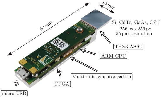 Timepix3 (TPX3) is a hybrid single photon counting pixel detector with semiconductor sensors. Due to its hybrid structure, which allows various combinations of thickness and material types of the semiconducting sensor with the same electronics of the readout chip, in dependence on the desired application, it is a handy, popular, and widespread detector in several different scientific and industrial fields []. Typical applications of this type of detector include usage in medicine [,], art [], quality control and material properties, as well as neutron detection [,,] or radiation source localisation and monitoring of the radiation environment [,]. Timepix detectors are also frequently used in the scientific domain, such as the ATLAS experiment [], suborbital rockets [,], and applications in space [], either on board the International Space Station [,] or as part of a separate satellite [,,] or CubeSat mission [,,,,,] to monitor space weather, solar flares [,] or other scientifically significant radiation phenomena.