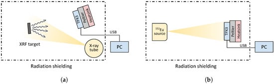 Each of these methods requires a different measurement arrangement. Therefore, two setups were prepared. To measure the energies generated by XRF, it was necessary to use an X-ray tube and a different geometrical arrangement compared to the application with radionuclides. Both setups use a holder for samples, and the whole arrangement was placed inside a radiation-shielded box. The schematic layouts are shown in Figure 2.