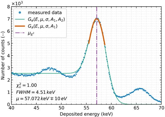 Goodness of fit and its quality are assessed using Pearson’s chi-square () test (Equation (4)), respectively, reduced chi-square () statistic (Equation (5)). It is possible to fine-tune the position of the mean () of the examined energy peak according to the distribution of , particularly the position of its minimum, under the conditions of the fit acceptability .