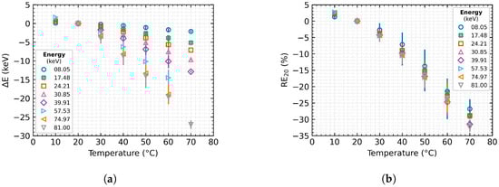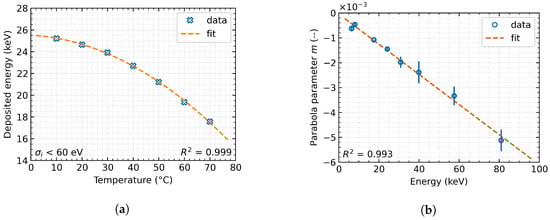 The examination of the measured data and subsequent processing (Figure 4) suggests a definable temperature dependence of the energy spectrum drift. Further processing allows us to describe the dependence of the measured energy on temperature (Figure 5a) and thus to establish Equation (6).
