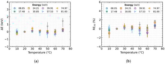 The evolution of absolute measurement accuracy and relative measurement error over the complete, tested range after applying the presented correction method is shown in Figure 6. The results are compiled over all tested detectors. A simple comparison with Figure 4 demonstrates the significant minimisation of the temperature dependence, the compensation of the thermal drift in the energy spectrum of the radiation, and the improvement of the obtained results. The plot shows that the absolute shift of the measured energy has been reduced by applying the correction from almost keV to ± keV over the entire tested energy and temperature range. The relative error of the measurements has thus also dropped from the original % (at 70 °C) to % thus staying within the ±% tolerance interval over the whole range. For a more accurate representation, Table 4 gives specific values for the same selected radiation source types and detector temperatures as in Table 3.
