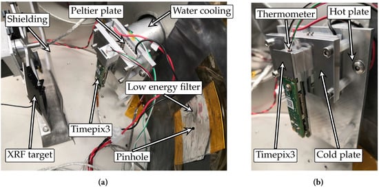 A detector MiniPIX TPX3 with a 1000 thick Silicon sensor, beyond the previously tested collection, was used to verify the proposed model and the extrapolation. It was operated at temperatures between −40 °C to 60 °C, requiring careful control of the test environment to prevent condensation and frosting on the detector because temperatures were deep below the dew point. Consequently, the device under test could have been short-circuited and irreversibly damaged. To mitigate this risk, the detector was placed in a vacuum chamber and thermally coupled and stabilised using a three-stage Peltier element (Figure 8). Waste heat was dissipated through a water cooling system outside the vacuum chamber. The temperature was stabilised for at least 10 min before each measurement and controlled with a feedback thermometer placed below the Timepix3 chip. An automatic carousel with multiple targets for generating XRF radiation at various energies was also placed inside the chamber.