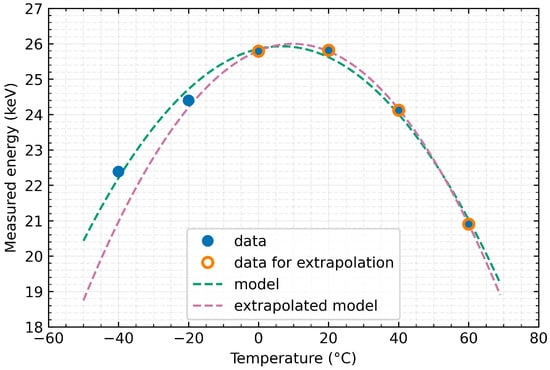 Model of temperature compensation of energy measurement (X-ray fluorescence with Tin target and detector in Time-over-Threshold mode of measurement and data-driven readout mode) distortion using Timepix3 detector with 1000 Silicon sensor in the temperature range from −40 °C to 60 °C. Extrapolated model based on data measured in temperatures above 0 °C is shown as well.