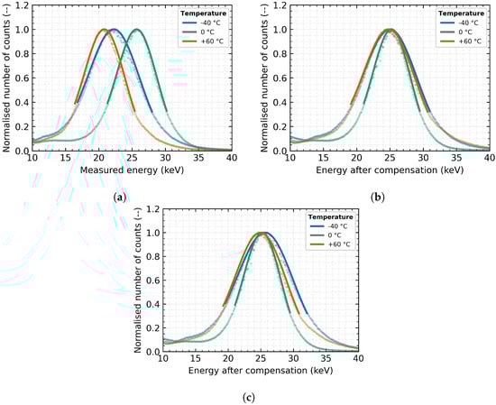 Applying the above-proposed compensation method with the parameters obtained from the previous characterisation of the detector E, the energy spectrum shown in Figure 7b can be produced. It can be seen from the figure that the effect of temperature distortion on the absolute accuracy of the measurement was nearly minimised to the relative error of measurement of less than 0.7%. At the same time, there is a clear trend of increasing energy peak width, common to all measurements and methods, thus deteriorating the detector’s energy resolution for high temperatures. This is due to the increasing thermal noise in the device.