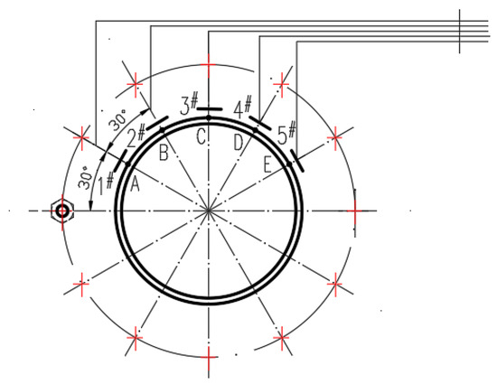The best solution for measuring the parameter value of the object is to place the corresponding sensor at the corresponding position of the object; however, in the detection of rolling bearing wear of precision machine tools, the existence of disassembly of the main moving parts of the machine tool leads to a decrease in accuracy. The detection value of the clearance between the outer ring of the rolling bearing and the spindle is affected by roller interference and other factors, making it difficult to implement the above method in the detection of spindle bearing wear of precision machine tools. Because the front bearing of the machining center is the component with the greatest force and wear in the main motion system, based on the analysis of the structure of the main drive system, the experiment used a displacement sensor arranged on the inside of the front bearing end cover of the spindle near the spindle, and indirectly realized the detection function of the front bearing wear by detecting the value of the external runout of the spindle during operation. Because it is difficult to predict the magnitude and direction of the force on the spindle during machining and the speed is too fast to result in the loss of experimental data owing to the lack of sensitivity of the testing instrument, the experiment was carried out under idling conditions with a spindle speed of 750 r/min. When the spindle is idle, the clearance caused by bearing wear is reflected in the upper part of the bearing bore under the action of self-weight. Therefore, the effective detection of bearing wear can be realized by arranging displacement sensors only in the upper part of the spindle. Based on a comprehensive consideration of the installation space and detection accuracy, five L3002-12.7 LVDT displacement sensors were placed in the upper part of the bearing-end cover, the configuration of which is shown in Figure 2.
