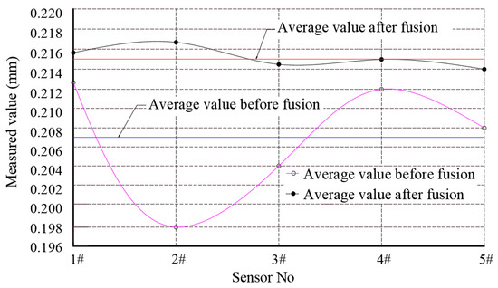 From the data shown in Table 3, it can be seen that the fused data values show two characteristics compared to the data before fusion processing: the measured values of different sensors at each detection point are evenly distributed around the mean value, the variability between the data is significantly reduced, the fused values increase significantly, and the amplification factor K is as high as 17.05 compared to that before fusion. It was verified that the fractional-order differential operator has amplitude-frequency characteristics that enhance the information’s intensity and reduce the variability among the information data. To compare the accuracy of the data before and after the fusion of the machining center spindle bearing wear, the data shown in Table 3 were divided by the amplification factor K to obtain the final value of the data shown in Table 2 after the fusion of the 0.5th order differential operator. The results are shown in Table 4.
