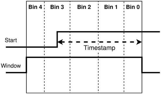 In Figure 16, the three time-bins (late–late, early–late/late–early, and early–early) are categorized on-chip. They correspond to bins 1, 2, and 3 respectively. Because a late event gets a smaller timestamp measured with respect to the end of the gating window, late–late corresponds to bin 1 (refer to Figure 4). Bins 0 and 4 correspond to events that are outside the bounds and are filled with noise triggered events. The bounds between each bins are programmable on-chip. This processing reduces the timestamp information (22 bits) to bin value (3 bits), which maximizes the potential throughput.
