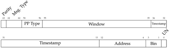 Dataframe of the the QKD output mode. UN [1 bit]: Unused. Bin [3 bits]: In which time-bin value the event is attributed to. Address [9 bits]: Address of the pixel. Timestamp [22 bits]: Relative timestamp to the end of the window in picoseconds. Window [21 bits]: Number of windows since last reset. PP Type [4 bits]: Post-processing type used. For example, “QKD Rel. Timestamp” or “QKD time-bin”. See Figure 2. Msg. Type [3 bits]: Message type. Indicates if it came from array the 8 × 8 or 1 × 14 array for example. Parity [1 bit]: Parity bit check.