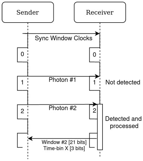 Diagram of the use of the Window field of the dataframe to synchronize the photons sent and received. The initial synchronization of the window clocks could be decided via a sequence of bright pulses or another absolute time reference. This synchronization of the window clock needs be done periodically to compensate for drifting.