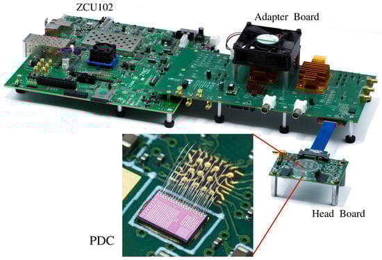 The testing setup is divided into three subsystems: the ZCU102, the adapter board, and the head board, as seen in Figure 8. The ZCU102 is a commercial board with a ZYNQ FPGA []. The adapter board was designed and assembled in-house with all the circuits needed for timing tests (clock generators, delays, buffers, etc.). The PDC is wirebonded on the head board and contains the buffers and voltage regulators.