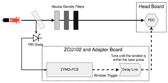 In typical operation, to get an absolute timestamp, the stop signal of the TDCs is the system clock. However, because we want a relative timestamp to the laser pulse emission for the time-correlated optical tests, the stop signal is programmed to be the end of the gating window. Hence, the output timestamp is the time difference between the arrival of the photon and the end of the window. If TDC gating is enabled, the TDC will ignore all events outside of this window. The window trigger signal can be the output signal of a laser, or, typically, the signal of a low-jitter photodiode as shown in Figure 9. The adapter board allows for a variable delay to shift the start of the window until a laser pulse arrives within the window.
