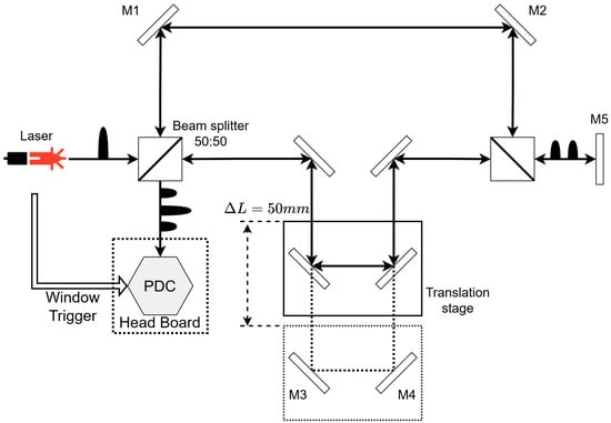 The optical test bench uses an ultrafast MaiTai Laser operating at 820 nm that feeds an optical parametric oscillator (OPO) that produces a beam at 410 nm by means of second-harmonic generation. The laser pulse width is <100 fs at an 80 MHz repetition rate (±1 MHz) []. The 410 nm beam is directed towards the PDC detector. In order to reduce the laser intensity to be a single photon, neutral density filters are added before reaching the PDC. The 820 nm beam is sent into a low jitter photodiode. The electric pulse generated by this photodiode acts as the time reference and is sent to the PDC.