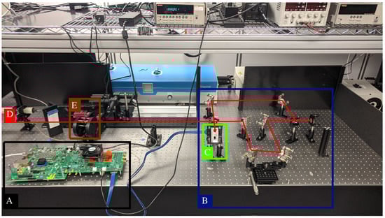 Laboratory setup for the Mach–Zehnder interferometer. The femtosecond laser comes in from the left (D, red). On the left, there is also the control board (A, black) for the detector from Figure 8. On the right is the MZI optical setup (B, blue) with the detector (C, green) in the middle, facing back. The optical setup (B, blue) is the same as the schematic of Figure 10. The neutral density filters (E, brown) can adjust laser power.
