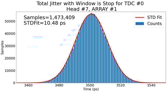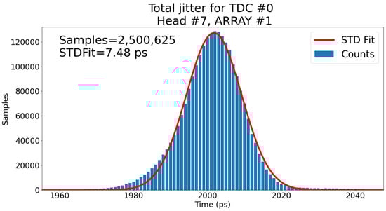 As an example, Figure 13 shows for TDC #0 (head #7) a jitter of 7.48 ps RMS when measured using the system clock as stop signal and a correlated trigger signal generated on the adapter board with a time-delay between these two signals swept from 0 to 4000 ps with steps of 1 ps. We can define the total jitter of the TDC system as Equation (1). Because the start and stop signals are correlated, it is not possible to separate the contributions of the start and stop jitter. This is why both are considered together and the measured jitter was <4.2 ps RMS (start is an external trigger and stop is the system clock). This means that the jitter of the TDC can be calculated to be ∼6.2 ps RMS. However, because in a real setting, the jitter of the system () does impact the total performance (), the total jitter will be used in results and comparisons. The jitter breakdown of Equations (1)–(3) is to understand which components have the most impact and if there are any bottlenecks. Note that in Equations (1)–(3), , , and  are all the same. External is the more generic case, which is essentially the start and stop signals, which, in turn, are the external trigger and clock in this case.