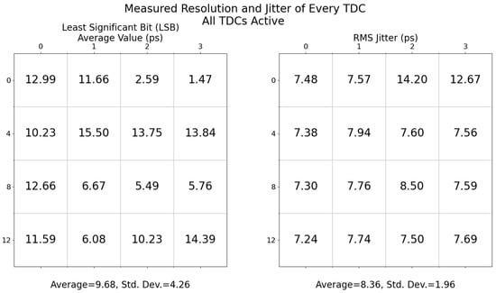 The resolution (LSB) and jitter of each TDC when all are operating at the same time. These results are for head #7 and array #1 of the chip. Due to variations in the fabrication process, not all TDCs have the exact same performance. This can be seen with the outliers, TDCs 2 and 3, having very fine resolutions and, consequently, higher jitter. The TDCs are indexed from the top left (0) to the bottom right (15), with the index of the leftmost indicated for each row.