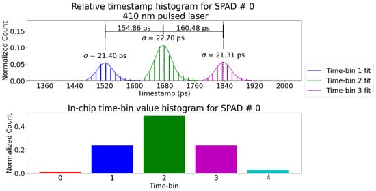 This results section is divided into two main sections (electronic and optical) and presents the cumulative jitter from TDCs to time-bin optical measurements. This is to illustrate how the array integration and component design choices impacted the final time-bin measurements. The electronics section presents the results using only the trigger signals from the testing boards presented in Section 2.2.1. The optical section presents the time-bin results done with the setup presented in Section 2.2.2.